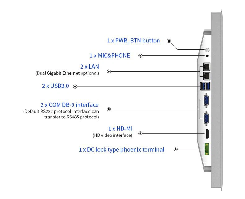 4. L'ordinateur industriel prend en charge diverses personnalisations d'apparence et de taille d'écran, plusieurs méthodes d'installation, prend en charge intégré, mural, bureau, VESA 100*100mm, etc.